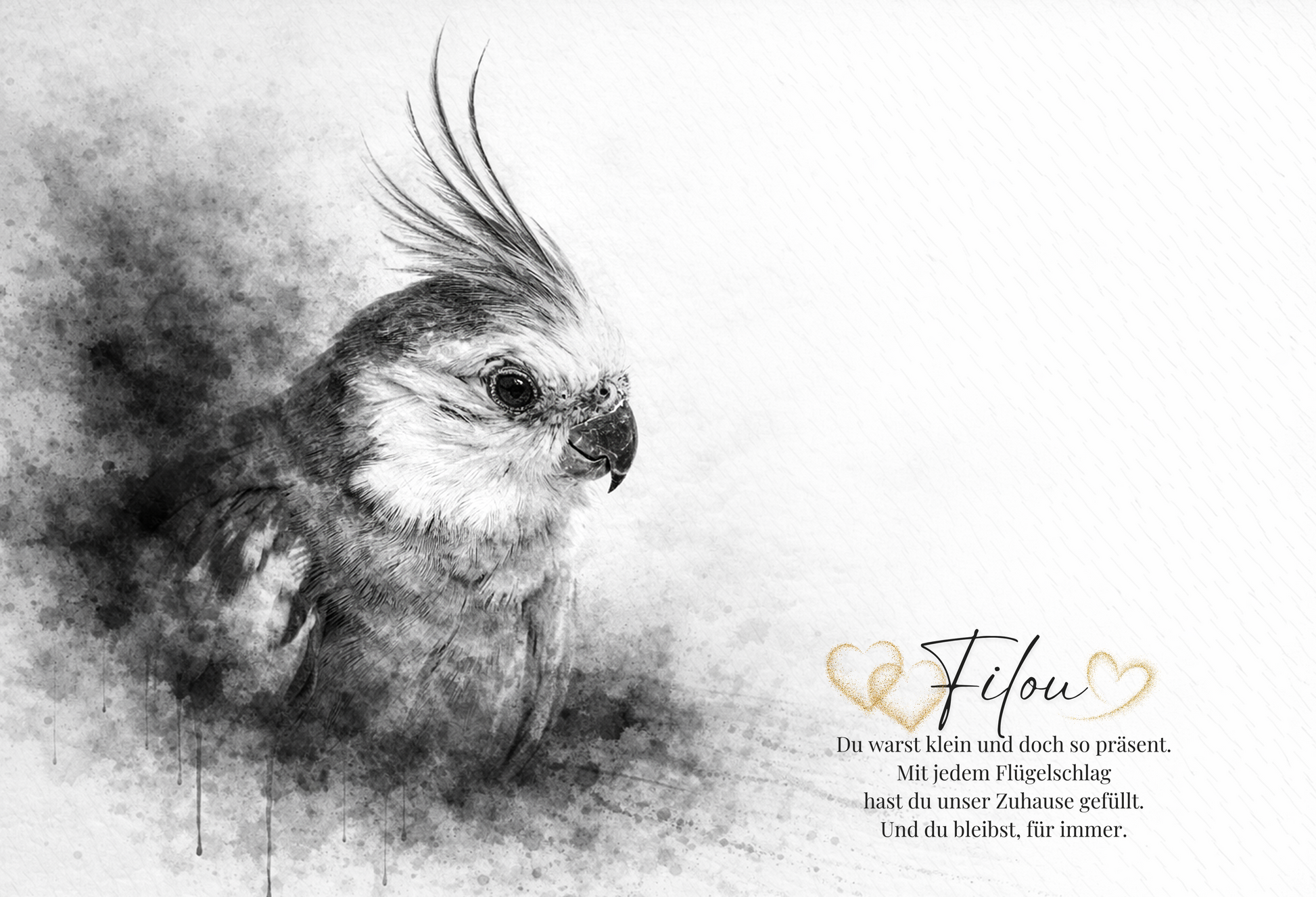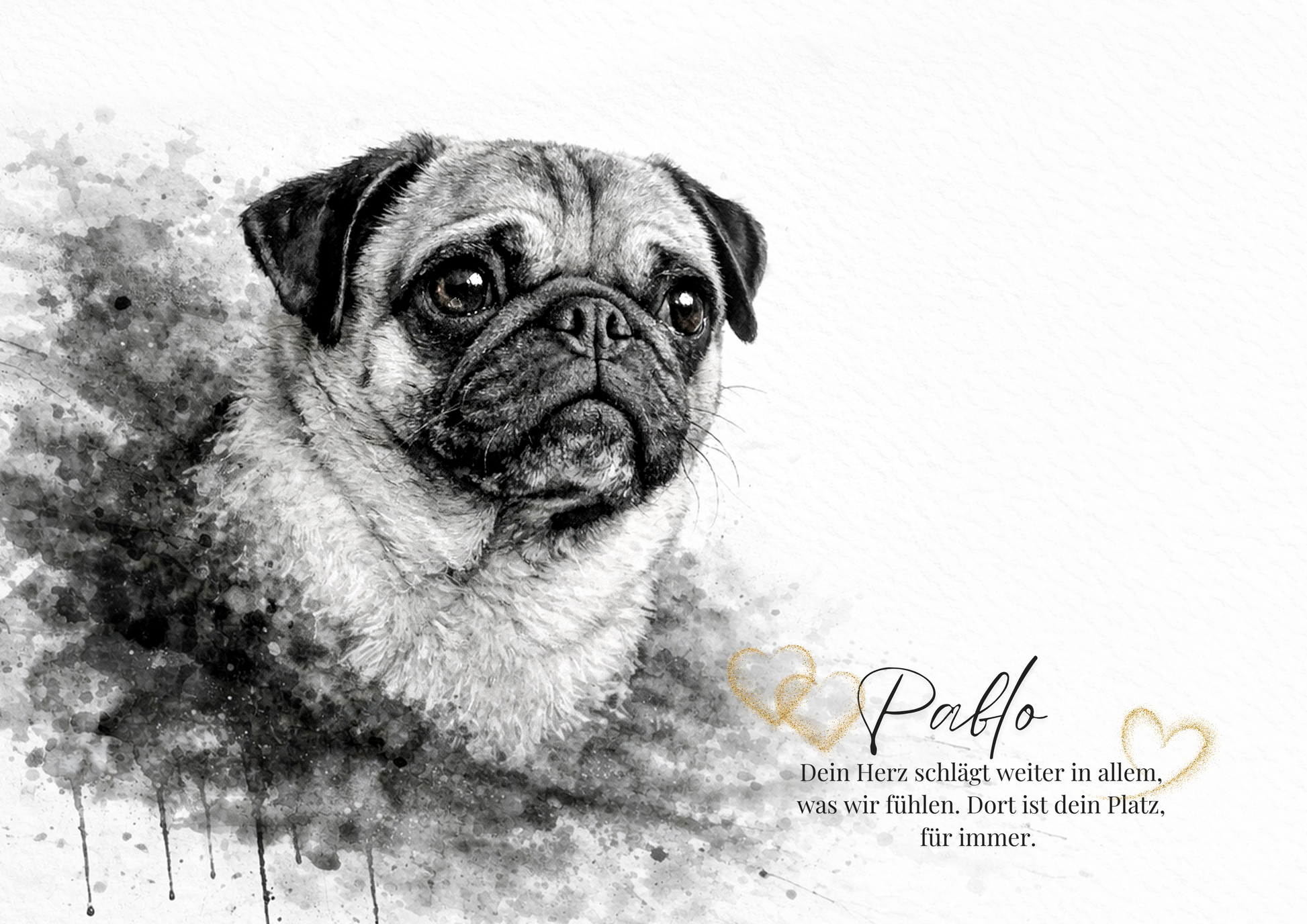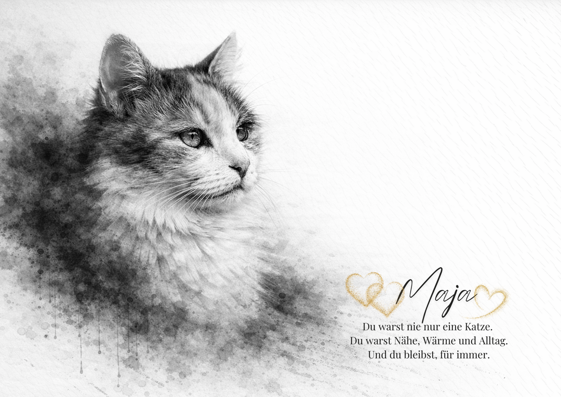 Dieses personalisierte Tierporträt im Aquarell-Stil wurde für Menschen geschaffen, die in ihrer Trauer eine ruhige, würdevolle Form der Erinnerung suchen. Der reduzierte, dunkle Bildstil lenkt den Blick ganz auf den Ausdruck und das Wesen deines Tieres – klar, ehrlich und zeitlos.