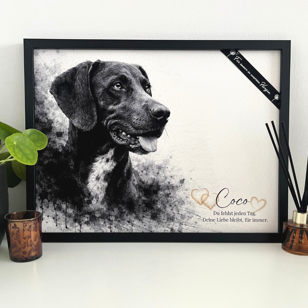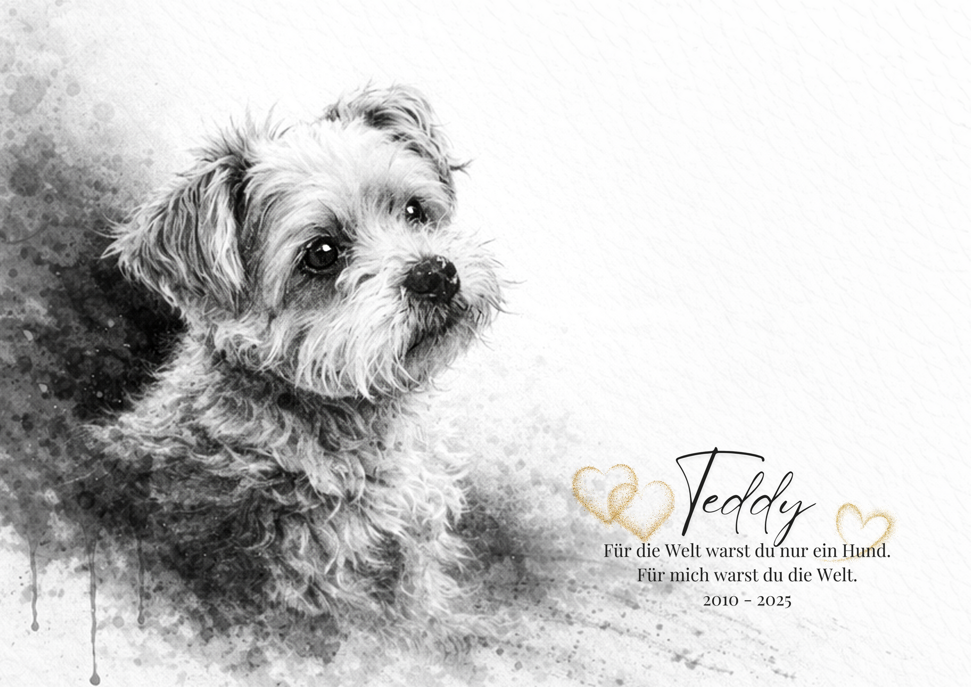 Jedes Tierporträt wird individuell und mit viel Feingefühl angefertigt. Gedruckt als hochwertiger Fine-Art-Kunstdruck wird es zu einem bleibenden Andenken an ein geliebtes Tier – für Menschen, die trauern, erinnern und die Verbindung zu ihrem Tier bewahren möchten.