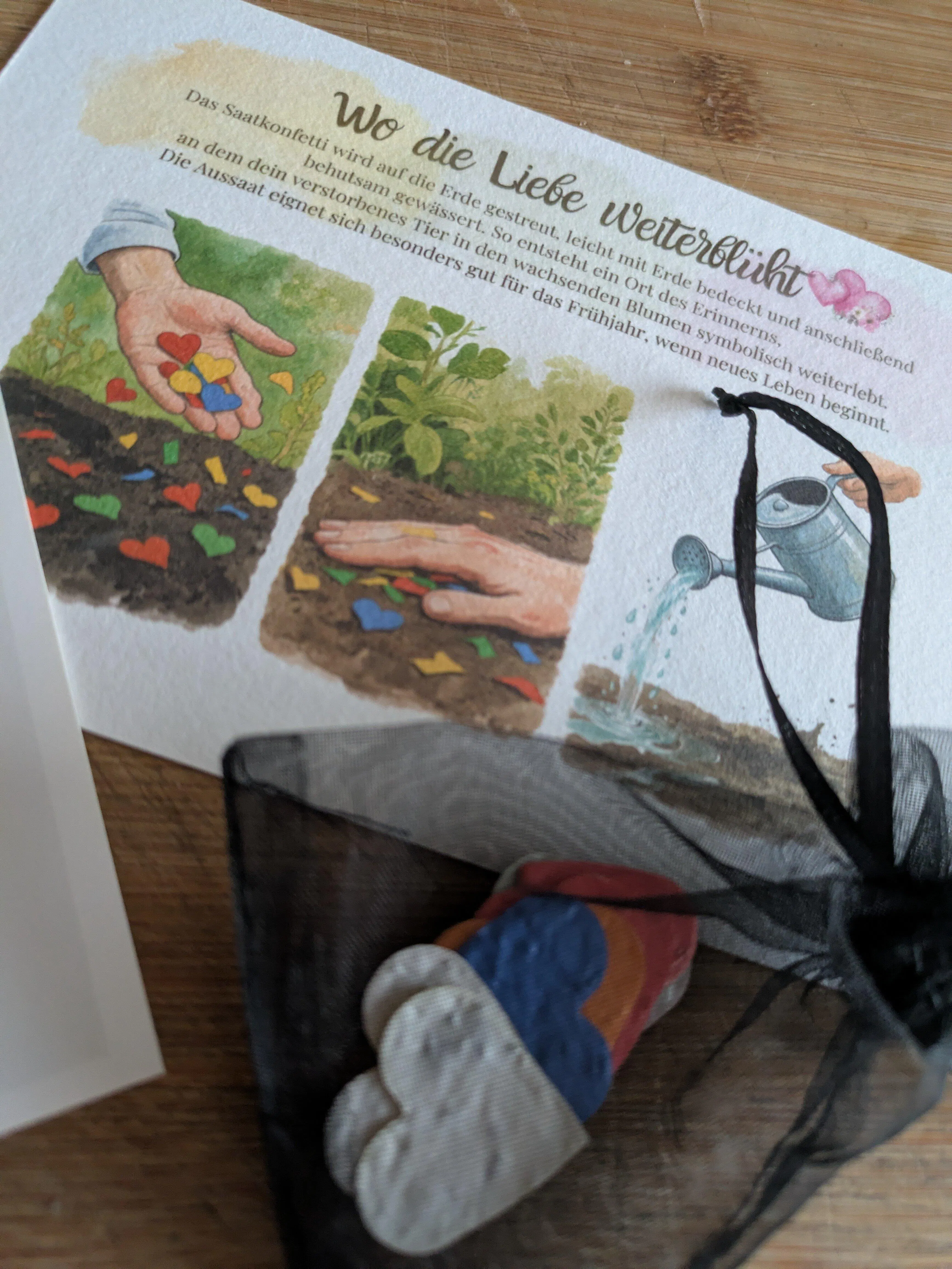 Als liebevolle Ergänzung erhältst du Saatgut in Herzform . Es steht für die Liebe, die nicht endet, sondern in Blumen weiterlebt – für Bienen, Schmetterlinge und all das Sanfte, das bleibt.